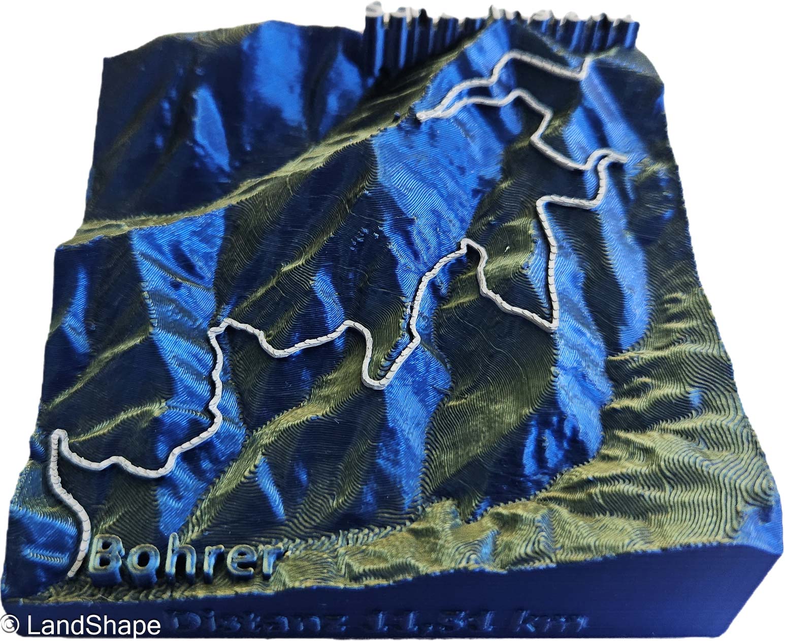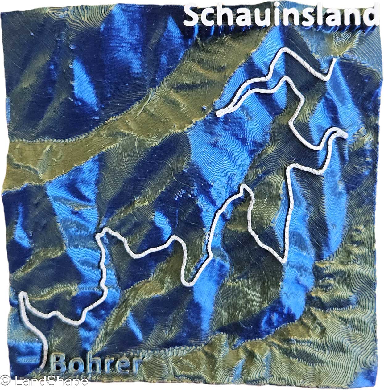 Die Schauinsland-Passstraße, stilvoll verewigt als erhabene, handcolorierte Linie auf einer Miniatur-Reliefkarte – minimalistisch, edel und voller Ausdruck. In schimmerndem Blau-Metallic zieht das Relief alle Blicke auf sich und erinnert an kurvige Höhen, frische Bergluft und den Moment, wenn die Passhöhe zum Greifen nah ist.