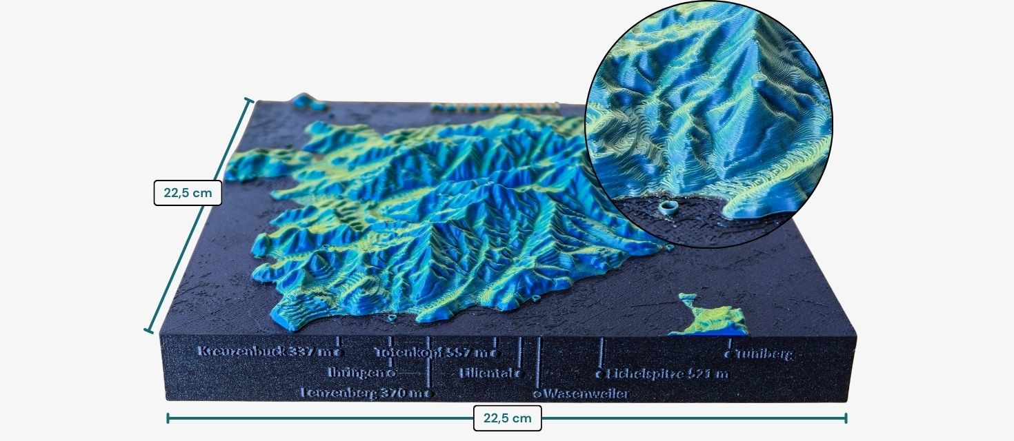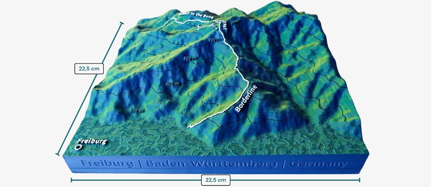 Unsere 3D-Reliefs entstehen aus einer tiefen Begeisterung für Landschaft, Bewegung und das räumliche Erleben von Natur. Diese Faszination begleitet uns seit vielen Jahren – auf dem Fahrrad, auf Reisen durch Berge und Wüsten und in unserer Wahlheimat Freiburg im Breisgau. Genau dieses Erleben übersetzen wir in unsere Produkte.