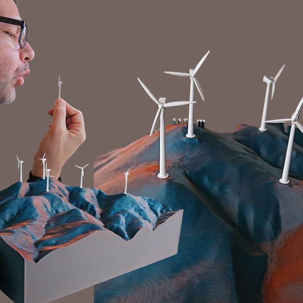 Den Windpark haben wir mit selbst 3D-gedruckten Miniatur-Windrädern ausgestattet, die direkt auf der Landschaft platziert sind. Das Besondere daran: Die Windräder sind beweglich – ein sanfter Atemzug genügt, und sie beginnen sich zu drehen.